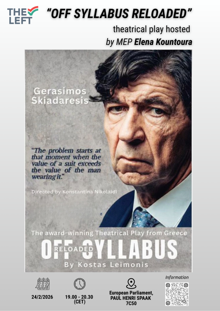 Το βραβευμένο θεατρικό έργο “Εκτός Ύλης reloaded” του Κώστα Λεϊμονή, με την καθηλωτική ερμηνεία του Γεράσιμου Σκιαδαρέση, παρουσιάζεται για πρώτη φορά στο Ευρωπαϊκό Κοινοβούλιο, σε μια ιδιαίτερα συμβολική παράσταση, που οργανώνεται και πραγματοποιείται με την υποστήριξη της Ευρωβουλευτή Έλενας Κουντουρά.